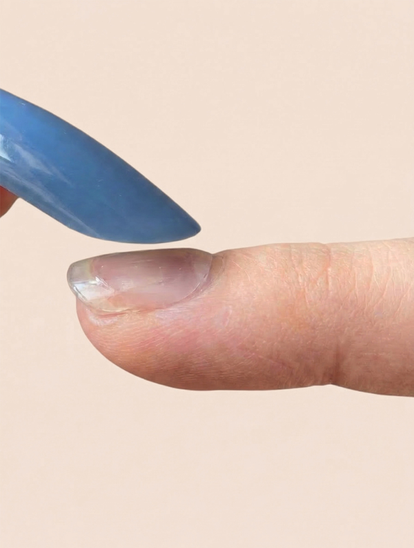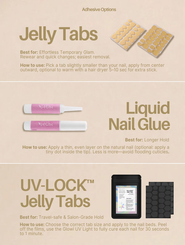 Place the tip at ~45° near the cuticle, rock it down toward the tip, then nudge it back to seat at the cuticle and press for 30-60 secs. If using UV-LOCK™ Jelly Tabs, cure each nail under the Glowi UV light for about 60 seconds.