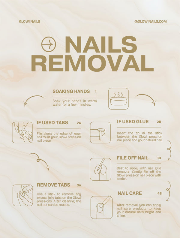 Work slowly—never force a lift. If a nail resists, pause and re-soften, then continue. After they’re off, cleanse any residue, lightly buff, and nourish with cuticle oil or hand cream. Wipe the press-ons clean, let them dry, and store them by size so they’re ready for your next wear.
