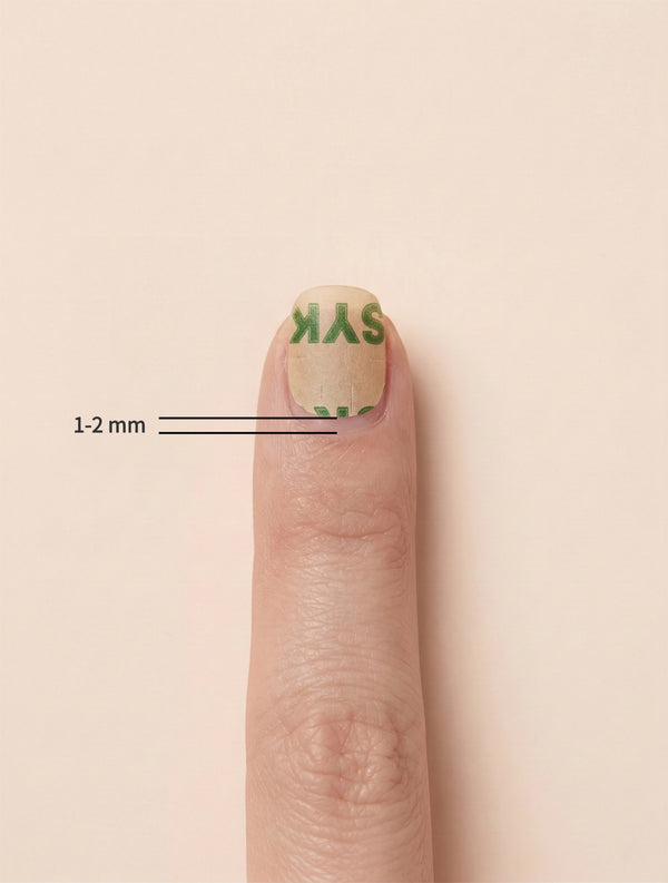 Choose a glue tab that fits, ideally a little smaller than your actual nail tip; stick it on 1–2 mm away from the cuticle. Repeat for 10 nails. Or apply a very thin layer of nail glue.