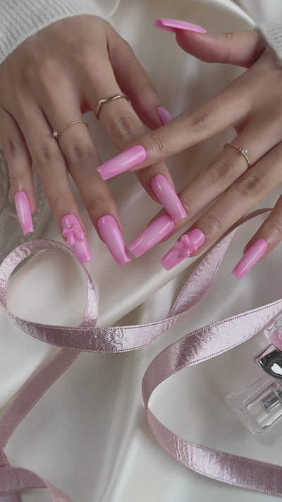 Bubblegum Bouquet evokes the playful innocence of spring with its luscious, candy-pink gel finish and ultra-glossy sheen. Each nail features meticulous contouring, while select accent nails bloom with sculpted 3D bows, symbolizing sweetness and youthful joy. Crafted with high-quality, lightweight resin, this set radiates a dreamy, soft-focus glow, turning fingertips into delicate petals. The design balances whimsy and sophistication, inviting a sense of nostalgia and lighthearted romance with every glance.